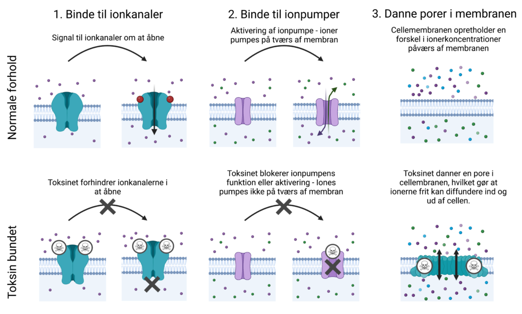 Figur 7. Neurotoksiner har generelt én af tre overordnede mekanismer til at angribe nervecellen. 1) Toksiner kan forhindre ionkanalerne i cellemembranen i at åbne. 2) Toksiner kan binde til ionpumper og herved blokerer dens funktion eller aktivering. 3) Toksiner kan danne porer i cellemembranen, hvilket tillader, at ioner frit kan diffundere ind og ud af cellen.