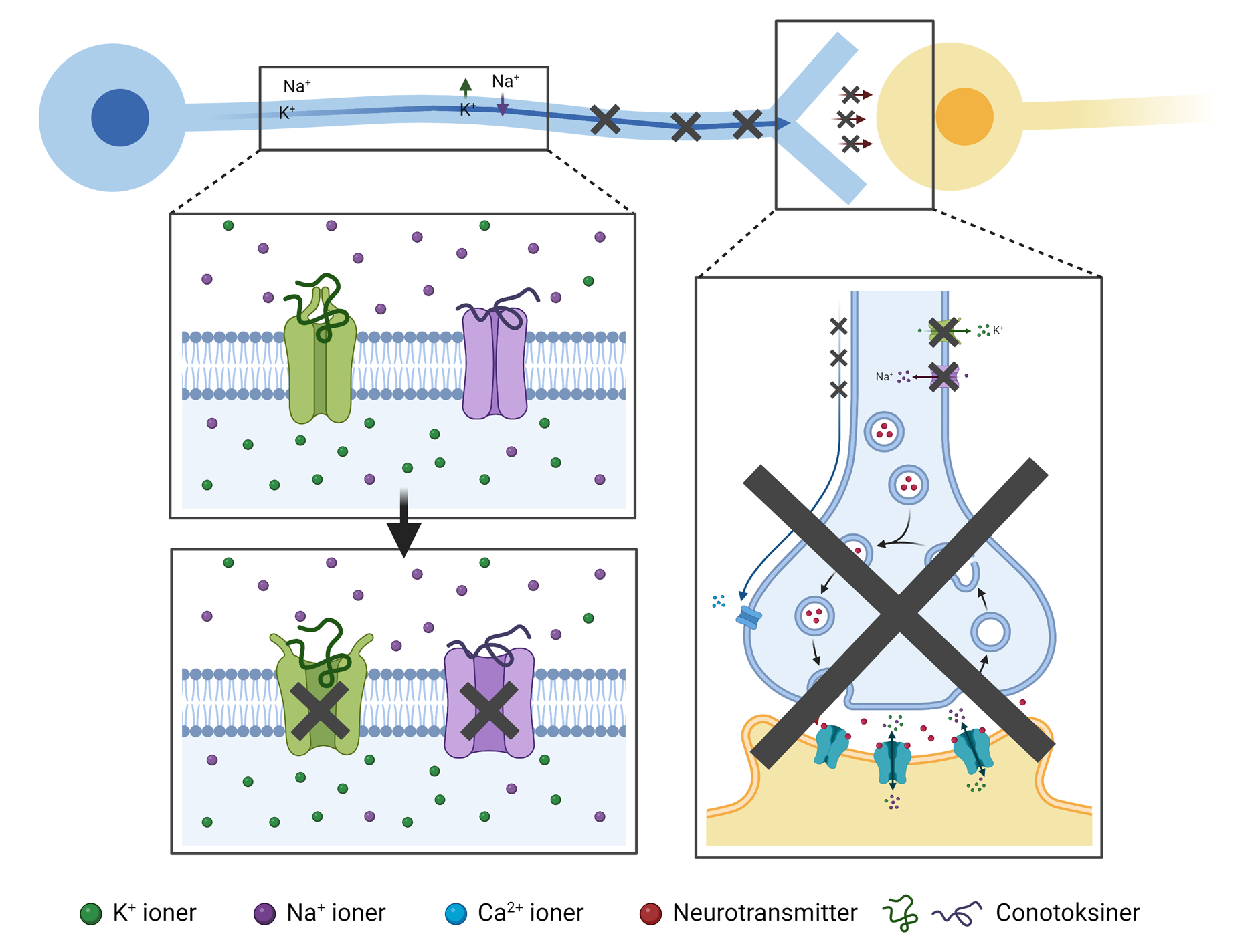 Figur 9. Conotoksiner binder til ionkanaler og forhindrer iontransport. Når denne figur sammenlignes med figur 8 kan man se hvor omfattende konsekvenser det har for nervecellens evne til at signalere.