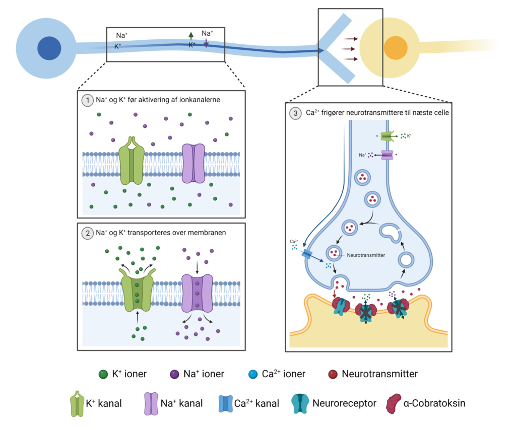 Hver gang en nervecelle skal aktiveres, og du bruger en muskel i din krop, sker det ved hjælp af signaler, der går fra hjernen og ned til musklerne via nervecellerne. Hjernen sender et signal, fx ”bevæg din finger”, og når nervecellen modtager signalet, skal signalet sendes videre. For at gøre dette, benytter nervecellen sig af forskellige ioner. I en hvilende nervecelle er koncentrationen af natriumioner (Na+) lav inde i cellen, mens koncentrationen af kaliumioner (Ka+) er høj (Figur 8, boks 1). Idet nervecellen modtager et signal og aktiveres, strømmer natriumioner ind i nervecellen, mens kaliumioner bliver lukket ud (Figur 8, boks 2). Ændringen af ionerne sker langs nervecellen og opfattes i den anden ende af nervecellen. Som et resultat heraf åbnes calciumionkanaler og calciumioner (Ca2+) lukkes ind i cellen, hvilket medfører at signalet kan videresendes (Figur 8, boks 3). Dette gøres ved hjælp af forskellige transmittere, blandt andet et lille molekyle kaldet acetylcholin. Nervecellen, der videresender signalet, frigiver acetylcholinen, der opfanges af en ny nervecelle. Idet acetylcholin binder til sin specifikke receptor, den nikotinerge acetylcholin receptor (nAChR), på den nye nervecelle, kan signalet fortsætte, og sådan videresendes signalet, indtil det når den muskel, der skal trække sig sammen. Efter signalet er sendt afsted fra nervecellen, genoprettes den originale koncentration af ioner, så cellen er klar til at modtage og videresende et nyt signal.