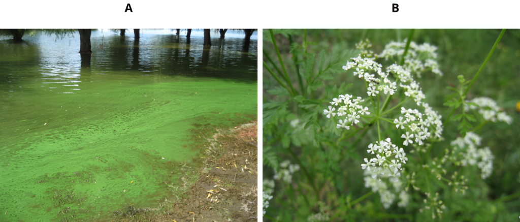Figur 6. A: Cyanobakterier kan til tider ses som et grønt tæppe på vandet, når temperaturen er høj. Billede af U.S. Army Corps of Engineers under licensen CC BY 2.0. B: I løbet af sommermånederne blomstrer skarntyden med hvide blomster. Billede af John Tann under licensen CC BY 2.0.