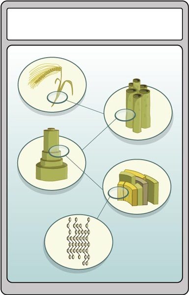 Figur 10. Sammensætning af en plantes cellevæg. Halmens strå består af fine stængler, hvis vægge igen består af stadig finere fibre, jo mere man forstørrer. Punkt fire illustrerer den meget tætpakkede strukturelle opbygning af lignocellulose med cellulose (gul), hemicellulose (grøn) og lignin (grå). På molekylært niveau (punkt 5) sidder de lange kæder af glukose, hvilke danner såkaldte mikrofibriller.