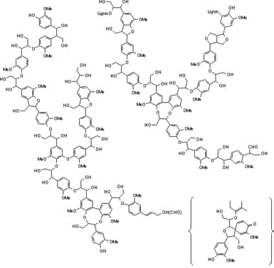 Lignin står for de sidste ca. 20-25 % af halmstrå og er en vand-uopløselig amorf blandings-polymer af phenylpropan enheder samt flere substituerede alkoholer. I modsætning til cellulose og hemicellulose består lignin altså ikke af kulhydrater. De forskellige molekylære enheder er knyttet sammen af bl.a. carbon-carbon- og aryl-ester-bindinger, og danner flere typer bindinger til polysakkariderne i hemicellulose (Colberg 1988). Nedenfor kan du se et eksempel på den kemiske opbygning af lignin. Denne komplekse rumlige sammensætning betyder, at lignin kun meget vanskeligt kan hydrolyseres og dermed nedbrydes. I plantecellevæggen fungerer lignin som uigennemtrængelig strukturel støtte og beskyttelse mod oxidation og mikrobielle angreb (Nielsen, Ahring & Angelidaki 1993, Pérez et al. 2002).