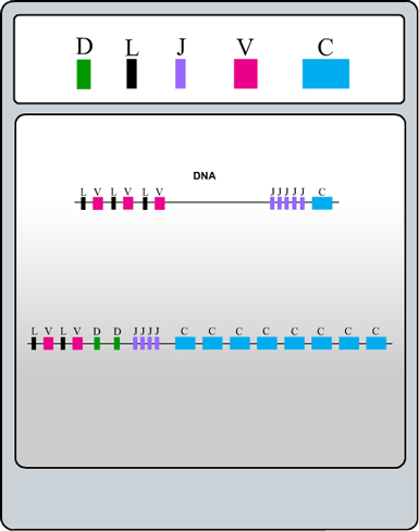 Inden B-cellerne forlader knoglemarven, sker der betydelige ændringer i deres DNA, som koder for antistoffer. Som det ses af figur 23, består DNA’et for antistofferne af en lang række forskellige L-, V-, J-, D- og C-sekvenser. Hver type sekvenser befinder sig i såkaldte multigen-familier. For hvert antistof produceret, er det dog kun en af hver af disse sekvenser, der er tilbage i det RNA, som bliver translateret, og der må derfor foregå en lang række modifikationer. Tilstedeværelsen af disse multigen-familier gør, at der er mange kombinatoriske måder, hvorpå generne kan omarrangeres. Det skyldes, at hvert ”færdigt” gen kun indeholder en af hver af sekvenserne. Således estimeres det, at der for de tunge kæders variable del findes 51 V-sekvenser, 27 D-sekvenser og 6 J-sekvenser, hvilket bringer de kombinatoriske muligheder op på 8262. Der er også mange muligheder for de lette kæder, hvilket yderligere øger diversiteten, idet enhver tung kæde kan sættes sammen med alle de mange lette kæder.