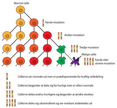 Under normale omstændigheder er produktion af nye celler og bortskaffelsen af gamle og defekte celler meget nøje reguleret for at kunne opretholde celleligevægt. Kræft er en genetisk sygdom, hvor flere forskellige mutationer opstår, og det giver enten cellen nyerhvervede funktioner eller tab af funktioner. Forandringen fra en normal celle til en kræftcelle sker i flere trin, hvor det kræver flere mutationer, før cellen får en fysiologisk ændring, der karakteriseres som kræft jf. figur 2. De voksende, muterede celler kan med deres nye egenskaber og fordele udkonkurrere de omkringliggende normale celler og med tiden udgøre en dominerende skare af genetisk ustabile celler. Denne genetiske ustabilitet øger tilbøjeligheden til at erhverve flere nye mutationer.