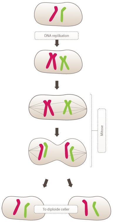 Figur 7. Celledeling er en del af cellecyklus. Efter DNA-kopieringen sendes cellen med nu dobbelt så meget DNA ind i den normale celledeling, mitosen. I mitosen vokser cellen og de to identiske DNA-sæt separeres vha. specielle proteiner (kaldt mikrotubuli eller tentråde). Efter separationen, under cytokinesen, deles cellen til to identiske datterceller med hver deres cellekerne og hver omsluttet af sin cellemembran.