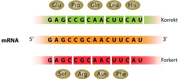 Figur 10. Mutationer i DNA-sekvensen kan medføre, at mRNA-sekvensen indeholder et rammeskift, som ændrer sekvensens codons. Dette kan medføre en ændret aminosyresekvens. Her burde mRNA-sekvensen aflæses som Glu, Pro, Gln, Leu og His, men pga. rammeskift mutation aflæses DNA-sekvensen som Ser, Arg, Asn og Phe.