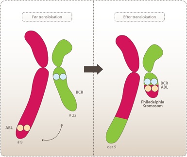 Kronisk myeloid leukæmi er et resultat af kromosom-translokation. I kronisk myeloid leukæmi findes en særlig kromosom-forandring, der giver det såkaldte Philadelphia- kromosom. Philadelphia-kromosomet er et nyt kromosom, som dannes ved translokation af genetisk materiale mellem kromosom nr. 9 og 22 – jf. figur 11. Der dannes derved nye arveegenskaber, det såkaldte BCR-ABL genkompleks. Dette nye genkompleks danner et nyt protein, som bevirker, at leukæmicellerne (de hvide blodceller) deler sig uhæmmet og lever længere end normale blodceller. Derved øges antallet af disse celler i blodet, i knoglemarven samt i milten, som bliver forstørret. Det er vigtig at understrege, at leukæmicellerne er på et umodent stadie og derved ikke kan udøve deres funktioner i immunforsvaret, men de tager pladsen fra de raske blodceller.