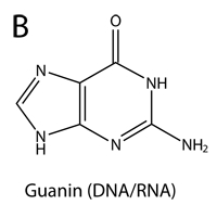 Figur 12. A. Benzo(a)pyren er et pro-karcinogen, dvs. det er på et stadie, før det bliver til et karcinogen. Dets cancerskabende mekanisme er afhængig af en enzymatisk reaktion, hvorved at benzo(a)pyren omdannes til benzo(a)pyren-diol-epoxid. Det er dette molekyle, der interkalerer med DNA og skaber DNA-mutationer. B. Guanin er en af de fire baser i DNA. Pga. dets aromatiske struktur og reaktive O- og OH- grupper kan benzo(a)pyren binde til guanin.