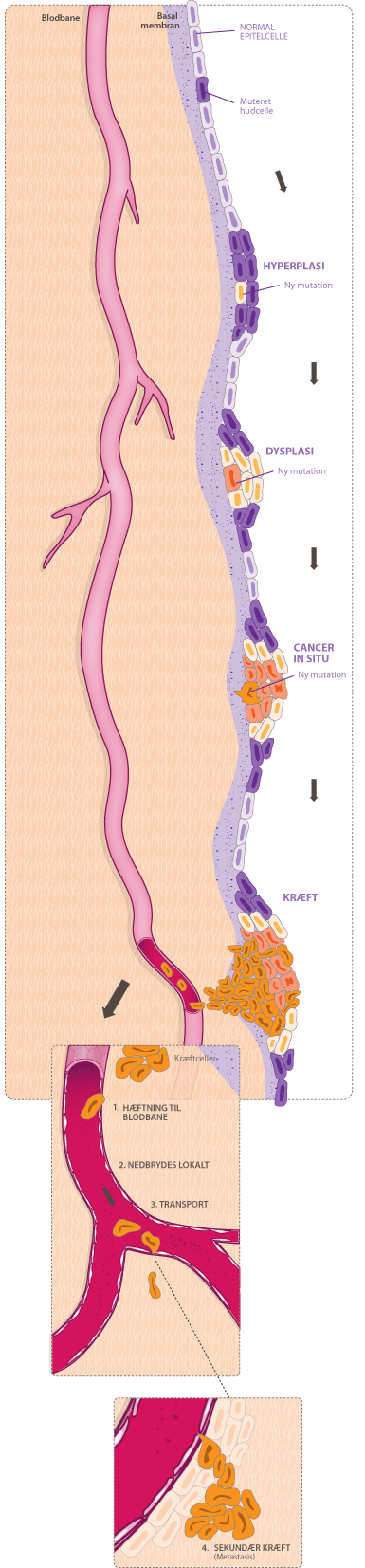 Figur 9. Metastase. Kræft kan sprede sig fra dens originale sted til et nyt sted i kroppen og fortsætte med at vokse og dele sig. Her ses, hvordan en muteret celle deler sig mere end normalt. Over tid udvikles en stor klump af muterede celler, der har en unormal form, som kaldes dysplasi. Dysplasi er typisk forstadier til kræft. Når kræften ikke er brudt gennem grænserne mellem de forskellige væv og stadig er lokaliseret til et sted i kroppen, kaldes det kræft in situ (latin: på samme sted). I andre tilfælde løsrives en kræftcelle fra dens originale klump af celler, transporteres med blodet og lymfesystemet og forplantes til et andet sted i kroppen. Herved opstår sekundær kræft, også kaldet metastase.
