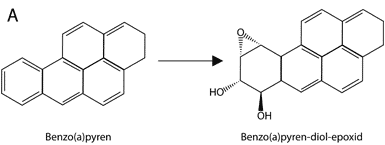 Tobak indeholder fx benzo(a)pyren, som er en 5-ringet aromatisk hydrocarbon. Dette molekyle er meget mutagent. Når benzo(a)pyren indhaleres ved rygning, kan det ved en enzymatisk reaktion omdannes til benzo(a)pyren-diol-epoxid, jf. figur 12. Dette molekyle kan interkaleres i DNA (indsætte sig i DNA’et) ved at binde til DNA-basen guanin. Binding af benzo(a)pyren- diol-epoxid til guanin medfører en mutation i DNA’et.