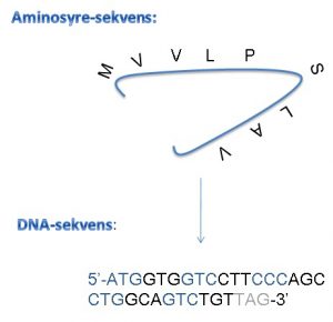 Ved hjælp af den genetiske kode kan aminosyresekvensen oversættes tilbage til den tilsvarende DNA-sekvens i genet (figur 12). Dette gøres ved at aflæse, hvilke codons i den genetiske kode, som de forskellige aminosyrer kodes af. Husk, at et codon er tre nukleotider af DNA. Fx koder codonet GTG for aminosyren valin (V). Alle codons kan aflæses i figur 3 i artiklen “Hvad er DNA og gener?”. Codon for codon kan DNA-sekvensen dermed findes. Mange organismers totale DNA (genomet) er efterhånden kendt, og herfra kan det enkelte gens DNA-sekvens ofte også let identificeres. Den tilsvarende DNA-sekvens vil være tre gange så lang som aminosyre-sekvensen, fordi tre nukleotider (ét codon), som nævnt, koder for én aminosyre.