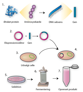 Figur 11. Oversigt over en rute til design og brug af cellefabrikker, som det forklares i denne artikel. 1. Genet for det ønskede produkt bestemmes ved fx at oversætte aminosyresekvensen til en DNA-sekvens. 2. Genet syntetiseres, så det er indsat i en ekspressionsvektor. 3. Der udvælges en celletype, som er i stand til at danne proteinet korrekt. 4. Cellen transformeres med ekspressionsvektoren. 5. De korrekt gensplejsede celler isoleres ved selektion med hjælp fra en bestemt sekvens i ekspressionsvektoren. 6. Organismen kan nu anvendes i en produktion ved fermentering. 7. Produktet oprenses efter fermenteringen, og produktets renhed sikres.