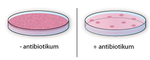 Figur 17. Kun de gensplejsede celler vil kunne gro på næringsplade med antibiotikum, fordi de har opnået et resistensgen i gensplejsningen.