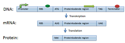 Figur 19. Oversigt over nødvendige, regulerende dele for gen-ekspression. Det ses desuden, om de er til stede på DNA-, mRNA og protein-niveau. Længderne på figuren svarer ikke til de aktuelle længder. RBS: Ribosombindingssted. ATG: Startcodon. TAG: Stopcodon