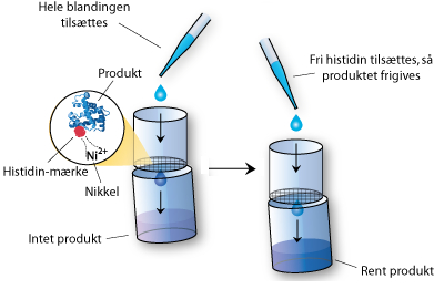 Histidin er en aminosyre, som gerne vil binde til metalioner som fx Ni2+ og Zn2+. Med en hel række af histidiner påsat for enden vil disse proteiner kunne binde til et net af nikkel-ioner, som oprensningsvæsken hældes igennem (figur 20).