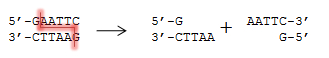 Restriktionsenzymerne virker ved at skære det dobbeltstrengede DNA over, typisk skråt, så der skabes enkeltstrengede ender (sticky ends) (se figur 1). Sticky ends har som navnet antyder en slags klistrende evne, da de komplementære, enkeltstrengede ender gerne vil finde tilbage til hinanden og genetablere deres indbyrdes tiltrækkende hydrogenbindinger ved almindelig baseparring. Denne tiltrækning eksisterer naturligvis ikke for de lige skårne blunt ends, så det kan være svært at vide, hvordan de sad sammen før skæring.
