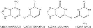 Figur 1. De fire forskellige baser i DNA-nukleotiderne. Adenin, cytosin og guanin bruges også i RNA, hvorimod thymin erstattes af en anden base.