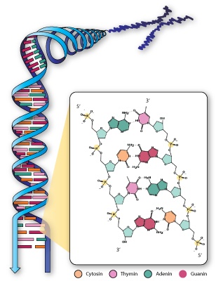DNA er dobbeltstrenget og består af fire forskellige nukleotider, der forkortes A, T, G og C. De baseparrer som A-T og C-G.