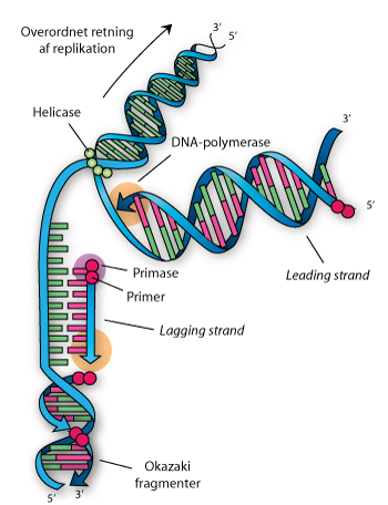 Ligesom RNA dannes de nye DNA-strenge ved at tilføje ét nyt nukleotid ad gangen og danne en binding mellem 5’-enden til 3’-enden på det nye nukleotid. Men da der er to modsatrettede strenge, betyder det, at de to DNA-polymeraser må bevæge sig i hver sin retning! De to strenges replikation følger hinanden i samme replikationsboble, men boblens bevægelse vil kun kunne gå i samme retning som én af strengene (kaldes leading strand). Derfor må den modsatte af strengene (lagging strand) dannes i små bidder, der følger med replikationsboblen. Disse mindre stykker kaldes Okazaki-fragmenter (se figur 8).