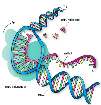 Bindingen af transkriptionsfaktorer gør det muligt for enzymet RNA-polymerase at binde sig til DNA’et for at foretage selve transkriptionen. RNA-polymerase er et meget stort enzym med en form lidt som en krappeklo. Med DNA’et i ’kloen’ bevæger enzymet sig langs DNA-strengen alt imens det syntetiserer mRNA-kæden ud fra DNA-sekvensen ved at bruge reglen om baseparring og komplementære