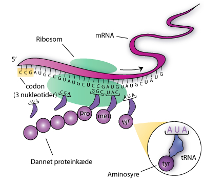 Translationen udføres af cellens ribosomer. De starter translationen i den position på mRNA’et, hvor de finder starten af et gen. Med kun ganske få undtagelser starter alle gener ved koden AUG. Dette får ribosomerne til at starte det nye protein med aminosyren methionin. Ribosomet læser nemlig hele tiden tre nukleotider ad gangen, således at næste aminosyre der indsættes i proteinkæden, afgøres af de følgende tre nukleotider efter AUG. Sådanne tre nukleotider, der læses til én aminosyre, hedder codons, og præcis hvilken aminosyre der fås af et bestemt codon, afgøres direkte af den genetiske kode (se figur 4).