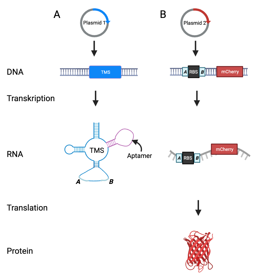 Figur 6 rettes til: Figur 6: De to plasmider, som vores E. coli producerer. (A) viser plasmid 1, der indeholder generne for TMS’en. TMS’en består af aptamersekvensen, som kan genkende PFOA, og to områder A og B, som kan binde til områderne A og B på plasmid 2 vist i (B). Plasmid 2 indeholder desuden bindingsstedet for ribosomet RBS, og generne for det røde protein mCherry. Hvis translationen ikke bliver blokeret af TMS’en, vil proteinet mCherry blive produceret. Figuren er lavet med Biorender.