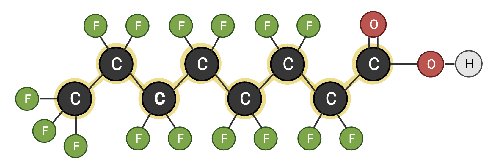 Figur 2: Et eksempel på et PFAS stof som kaldes PFOA. PFOA består af en kulstofkæde med 8 carbonatomer (C8), hvor brintatomerne er fuldstændigt erstattet med fluoratomer. Kulstofkæden er markeret med gul. Figuren er lavet af Biotech Academy med Biorender.
