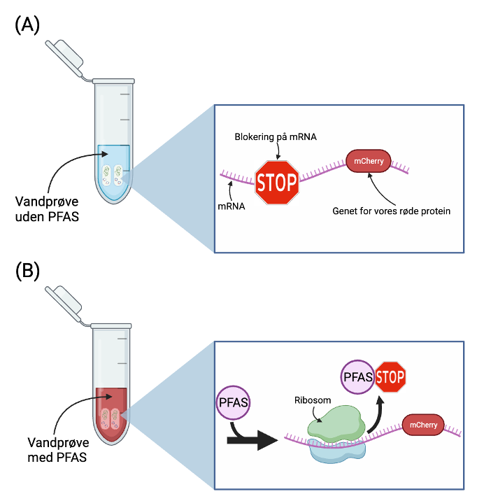 Figur 5: Forskellige vandprøver: PFAS er ikke til stede i vandprøve (A), men PFAS er til stede i vandprøve (B). (A) mRNA er blokeret, og dermed kan translationen af det røde protein, mCherry, ikke forløbe. Prøven bliver således ikke rød. (B) PFAS er til stede i vandprøven og binder til blokeringen (”STOP”). Dette tillader ribosom binding, og translationen af mCherry forløber. Derved bliver vandprøven rød. Figuren er lavet med Biorender. Stop Sign under licensen CC BY 2.0.