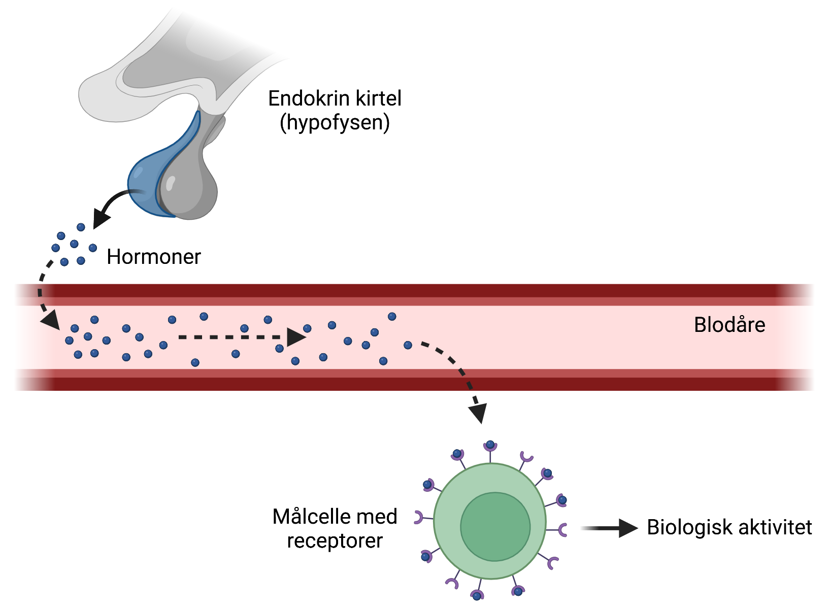 Figur 1: Hormonets vej til sin målcelle. Hormonet frigives fra en endokrin kirtel såsom hypofysen. Det transporteres gennem blodårerne frem til sin målcelle. Når hormonet binder til receptorer på målcellen, sker der en biologisk aktivitet.