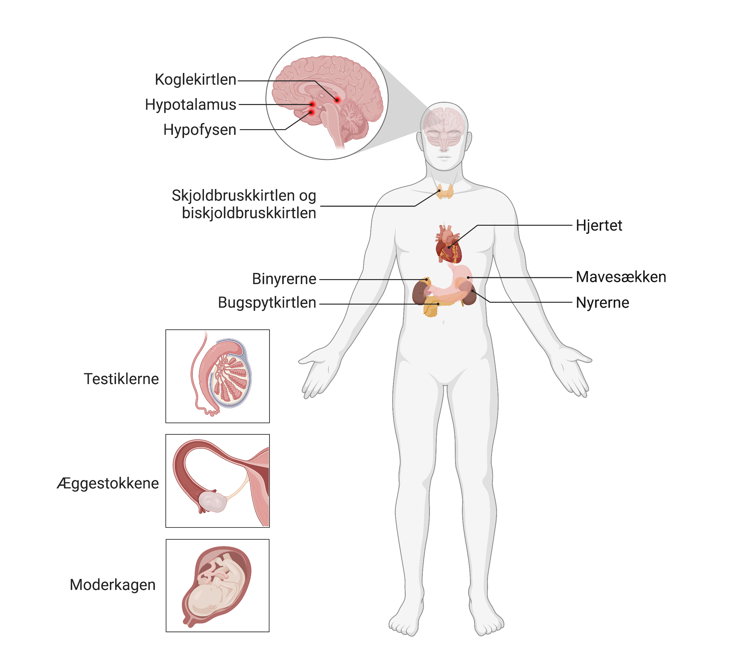 Figur 2: Endokrine kirtler. Hormoner produceres i endokrine kirtler forskellige steder i kroppen. For eksempel produceres insulin i bugspytkirtlen, østrogen i æggestokkene og væksthormon i hypofysen.