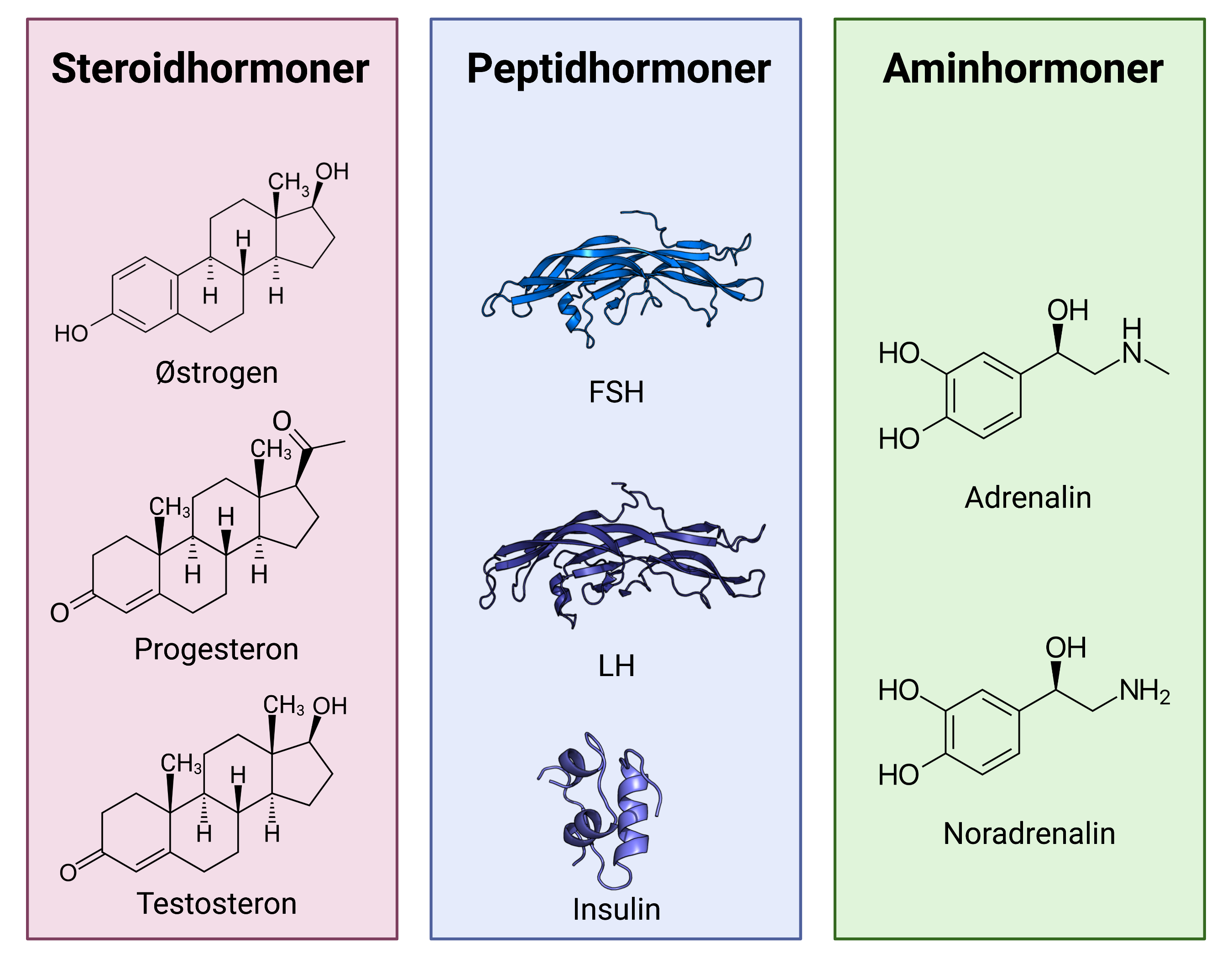 Figur 3: Hormontyper. Der findes tre forskellige slags hormoner: Steroidhormoner, peptidhormoner og aminhormoner. Steroidhormoner syntetiseres ud fra kolesterol og inkluderer bl.a. kønshormonerne østrogen, progesteron og testosteron. Peptidhormoner kan bestå af flere hundrede aminosyrer. Follikelstimulerende hormon (FSH), luteiniserende hormon (LH) og insulin er eksempler på peptidhormoner. Aminhormoner syntetiseres ud fra aminosyrerne tyrosin eller tryptofan. Adrenalin og noradrenalin er aminhormoner syntetiseret ud fra tyrosin.