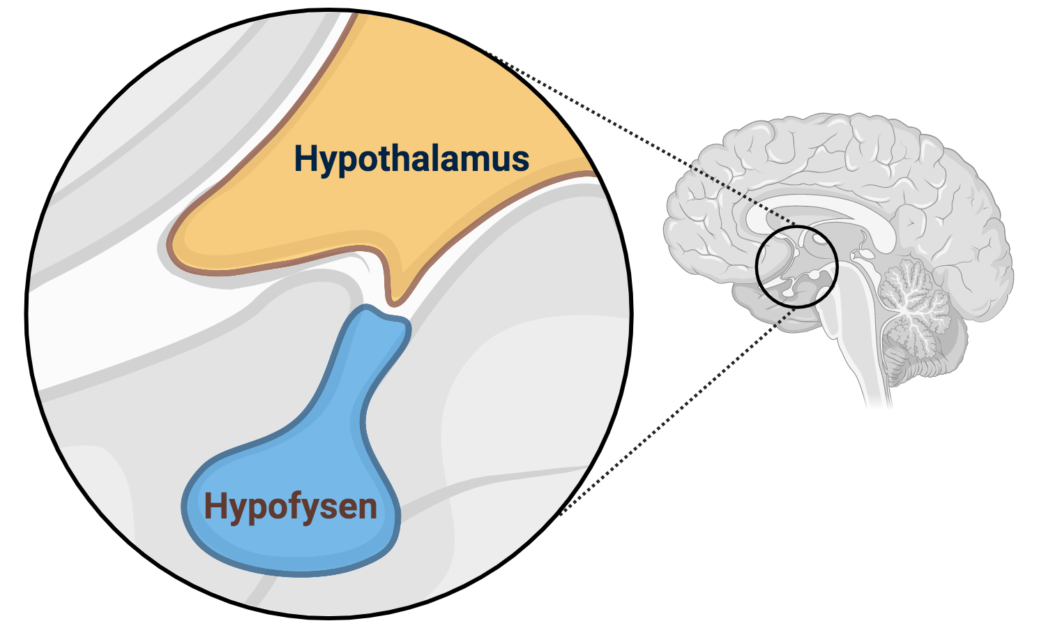 Figur 4: Hypothalamus og hypofysen. De to endokrine kirtler producerer mange overordnede hormoner, som regulerer en masse andre endokrine kirtler rundt omkring i kroppen.
