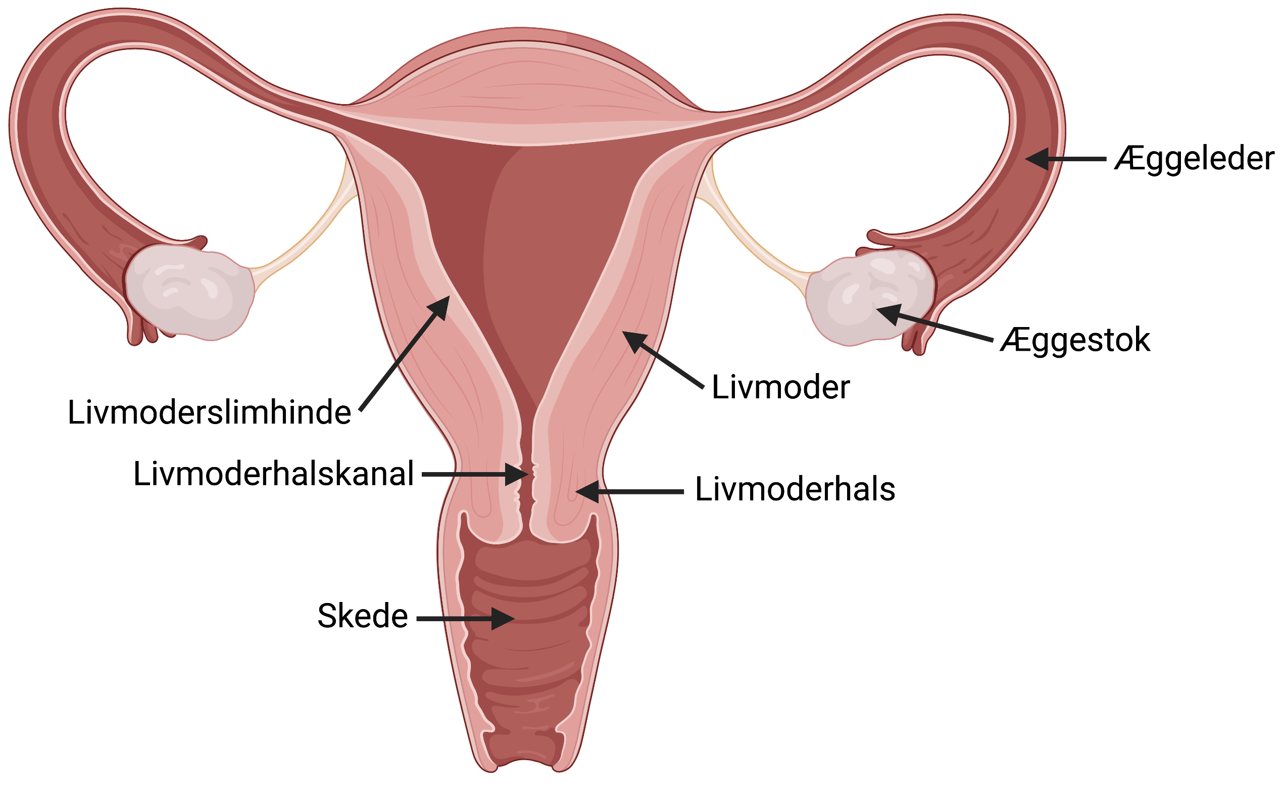 Figur 1: De indre kvindelige kønsorganer. De indre kvindelige kønsorganer består bl.a. af livmoderen, hvoraf indersiden er dækket af livmoderslimhinde. Omkring livmoderen er der to æggeledere, som hver har en æggestok. Livmoderen ender ud i en livmoderhalskanal, hvor skeden er.