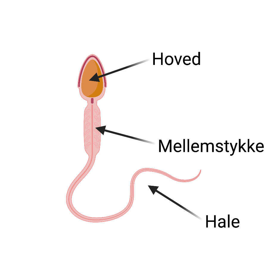 Sædceller er 0,05 mm lange. Til sammenligning er et riskorn 100 gange så stort. Sædceller består af et hoved, et mellemstykke og en hale. På figur 3 kan du se en tegning af en sædcelle. I hovedet opbevares DNA’et, og i mellemstykket er der en masse mitokondrier, som producerer energi til sædcellen. Halen sørger for, at sædcellen kan bevæge sig og komme frem til ægcellen ved en eventuel befrugtning. Sædcellerne dannes i testiklerne, hvor der i gennemsnit produceres 2300 sædceller i sekundet. Når sædcellerne er produceret, opbevares de i bitestiklerne, hvor de modnes og opbevares indtil de frigives ved sædudløsning eller går til grunde. I én sædudløsning er der omkring 200-300 millioner sædceller. Det tal kan være variere alt efter sædkvaliteten, og hvor hyppigt man har udløsning. Under sædudløsning transporteres sædcellerne fra testiklerne, igennem sædlederne og ud gennem urinrøret. Det kan ske med op til 50 km/t.