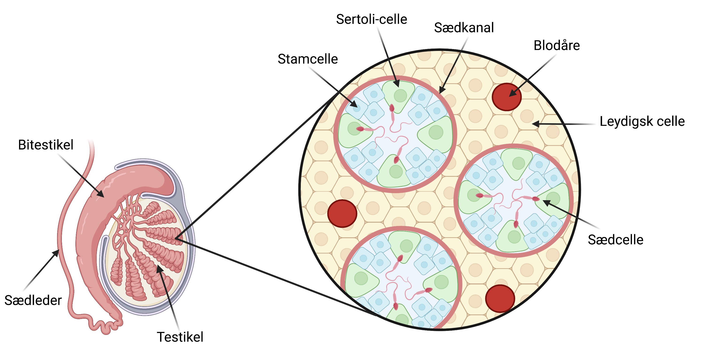Figur 4: Testikel og bitestikel med sædkanaler. Sædceller dannes ud fra stamceller i sædkanaler i testiklerne. Sertoli-cellerne er en form for støtteceller, der ernærer sædcellerne under udvikling. Imellem sædkanalerne ligger de Leydigske celler, som producerer testosteron. Testosteron er vigtigt for sædcellernes udvikling. Når sædcellerne er dannet, opbevares de i bitestiklerne. De kan forlade bistestiklerne ved en sædafgang gennem sædlederne.