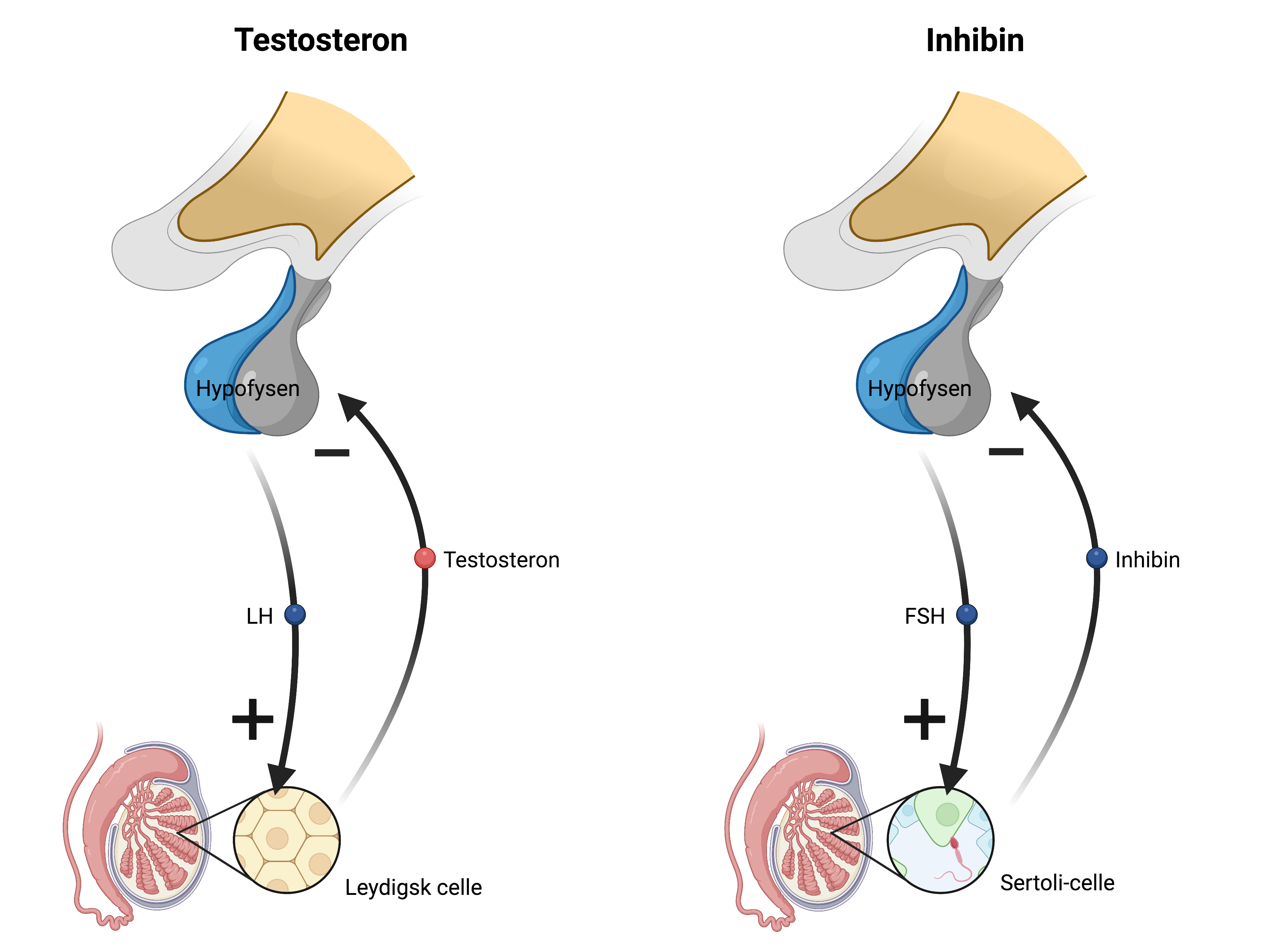 Figur 5: Negativ feedback regulering af testosteron og inhibin. LH bliver produceret i hypofysen og stimulerer de Leydigske celler i testiklerne til at producere testosteron. Testosteron hæmmer produktionen af LH. FSH bliver også produceret i hypofysen og stimulerer Sertoli-cellerne til at producere inhibin. Inhibin hæmmer produktionen af FSH.