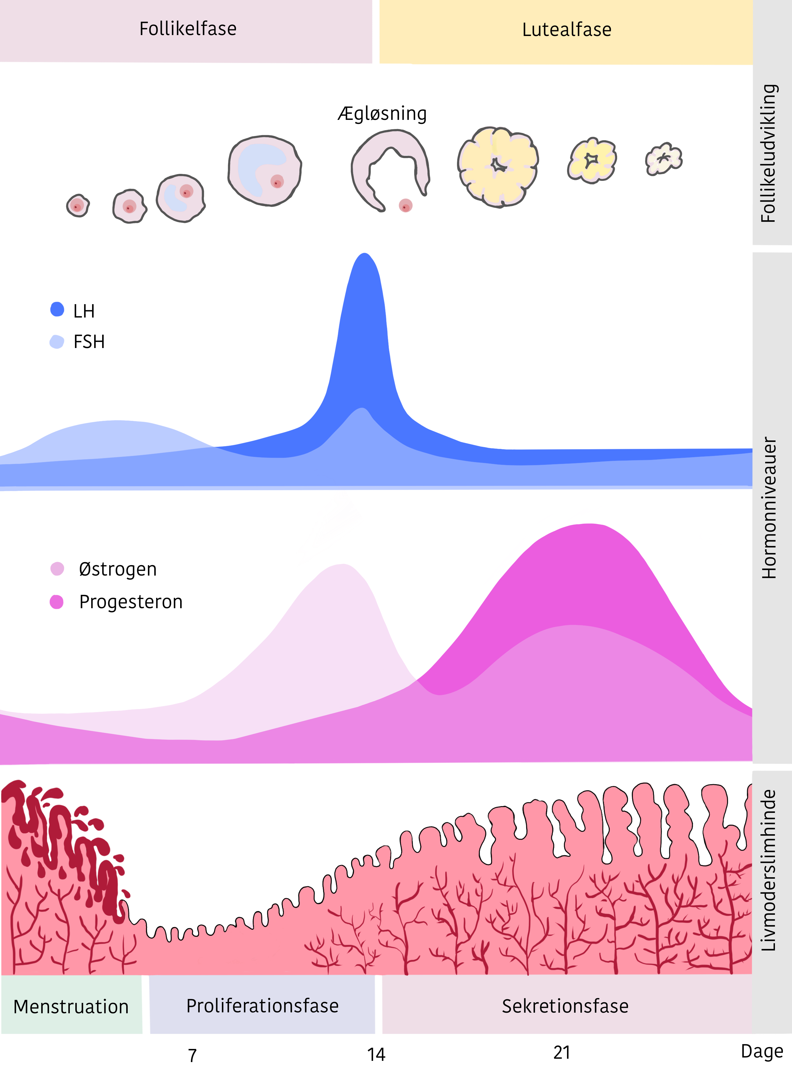 Figur 2: En gennemsnitlig menstruationscyklus. Øverst ses folliklens udvikling, hvor der omkring dag 14 sker en ægløsning. Perioden inden ægløsning kaldes follikelfasen/proliferationsfasen. De første 5-7 dage i proliferationsfasen kaldes også menstruationsfasen, fordi blødningen sker her. Perioden mellem ægløsning og næste menstruation kaldes lutealfasen/sekretionsfasen. Derudover angives hormonniveauerne for LH og FSH samt for østrogen og progesteron. Nederst ses livmoderslimhindens udvikling.