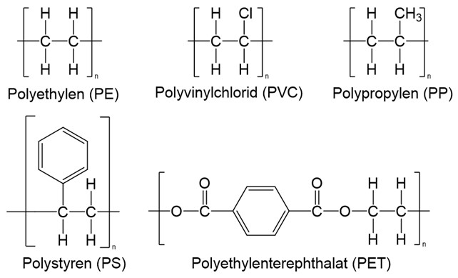 I figur 10 er der en oversigt over monomeren af 5 mest almindelige plastiktyper. Klammen og n ’et viser, at de danner en polymer. R-grupperne er de næste monomerer i kæden.