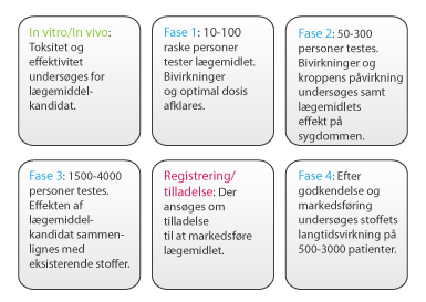 Når nye lægemidler udvikles, skal de naturligvis også testes i mennesker. I Danmark kræver myndighederne, at nye lægemiddelkandidater først er gennemtestet for toksikologi og bivirkninger i forsøgsdyr. Herefter kan lægemiddelkandidater blive godkendt af Lægemiddelstyrelsen og Den Centrale Videnskabsetiske Komité til at gå over i de fire kliniske faser. De kliniske faser er langt den dyreste del i udviklingen af nye lægemidler. Ud af f.eks. 5.000-10.000 stoffer er der måske kun fem, som går videre til de kliniske faser, og heraf kun et stof, som bliver et lægemiddel.