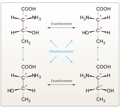 Figur 11. På dette billede ses fire stereoisomerer af aminosyren threonin. Stereocentrerne er angivet med en rød stjerne.