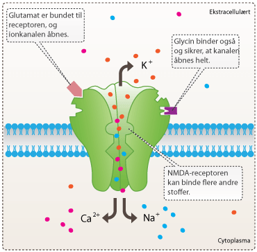 NMDA-receptoren har stor betydning for den excitatoriske neurotransmission i hjernen, hvilket betyder, at den er med til at forstærke signaloverførsel mellem nervecellerne i hjernen. Receptoren findes i nervesynapser, hvor den aktiveres, når glutamat bindes til den. Receptoren aktiveres af både glutamat og aspartat, men aspartat virker dog ikke lige så kraftigt som glutamat. Receptoren kræver desuden en co-agonist som glycin for at sikre en optimal åbning af receptorens ionkanaler. Glutamat er det primære excitatoriske neurotransmitterstof, som bruges i alle områder af hjernen. NMDA-receptoren er permeabel for Ca2+ ioner (se figur 6). Ca2+ strømningen igennem NMDA-receptorens ionkanal gør den helt speciel, da Ca2+ kan igangsætte mange forskellige processer i cellen. Forskere mener bl.a., at indstrømningen af Ca2+ er skyld i de molekylære ændringer, der har betydning for lagringen af langtidshukommelsen.