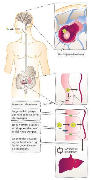 Stoffer, som optages gennem epitelcellerne i tarmen, bevæger sig hurtigt over i blodbanen. Det er dog ikke alle molekyler, som opløses i blodet. Upolære molekyler opløses ikke, men transporteres af forskellige transportproteiner. Fra blodbanen distribueres stoffet til leveren og derfra ud til de forskellige væv og organer. Et stof siges at være effektivt, hvis det rammer målorganet i tilstrækkelig koncentration. Visse dele af kroppen er dog særlig svære at nå. Dette er f.eks. tilfældet med centralnervesystemet (CNS). På trods af den gode blodgennemstrømning i hjernen, er den svær at nå med aktive lægemidler pga. blod-hjerne-barrieren (BBB for engelsk blood-brain-barrier). BBB er opbygget af endotelceller, som sidder meget tæt for at forhindre passage af stoffer mellem cellerne. Derved opretholder BBB et konstant ekstracellulært miljø i hjernen. Upolære substanser diffunderer over BBB forholdsvis uhindret, mens polære molekyler skal transporteres af specielle transportproteiner. Dog kan polære molekyler nemmere opløses i blodet.