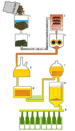1: Støbning, 2: Maltning, 3: Tørring, 4: Formaling, 5: Mæskning, 6: Filtrering, 7: Kogning af urt, 8: Gæring og modning, 9: Tapning
