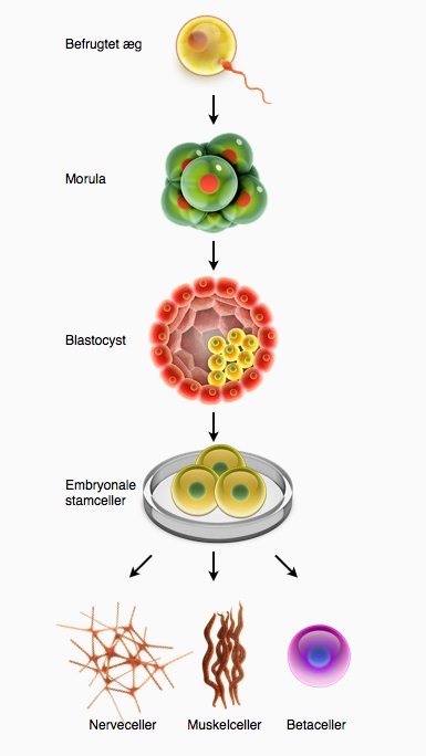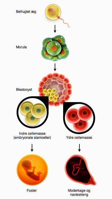Det befrugtede æg deler sig flere gange og kaldes en blastocyst, når det består af ca. 100 celler. Blastocysten består af to forskellige celletyper, så der er allerede her sket en differentiering. Den indre cellemasse i blastocysten består af stamceller, som udvikler sig til det egentlige foster. Man kan få den indre cellemasse til at vokse i en petriskål i laboratoriet, og det er på den måde, at en kultur af embryonale stamceller kan etableres. Det er disse celler, der normalt benyttes, når der tales om ”forsøg med stamceller” eller ”ES-celler”. De embryonale stamceller bevarer deres funktion, når de dyrkes i laboratoriet. De rummer således muligheden for at kunne differentiere sig til alle kroppens mere end 200 kendte celletyper. Det er dog vigtigt at understrege, at de alene ikke kan danne et nyt menneske, da de ikke kan differentiere sig til cellerne i navlestrengen og moderkagen.