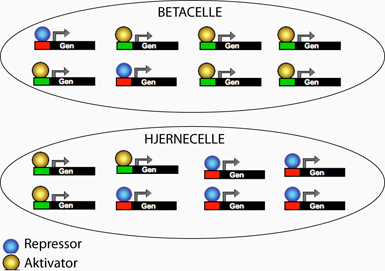 Alle celler i kroppen indeholder præcis de samme gener i deres DNA, så hvordan kan de udvikle sig forskelligt? Det skyldes, at det i cellerne er meget forskelligt, hvilke gener der er aktiveret. F.eks. har alle celler i kroppen genet for insulin, men kun i betacellerne er det aktivt. Om et gen er aktivt, kan reguleres af såkaldte transkriptionsfaktorer. En transkriptionsfaktor er et protein, der kan binde til et gen og derved bestemme, om genet bliver udtrykt. Det ses ofte, at et signalprotein binder til en receptor på en celle, hvorefter en bestemt transkriptionsfaktor aktiveres. Transkriptionsfaktoren bestemmer herefter, om et bestemt gen aktiveres eller ej. Der er to forskellige former for transkriptionsfaktorer, hvoraf den mest almindelige kaldes en aktivator.