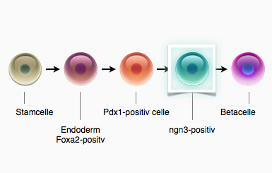 Vejen fra en stamcelle til en betacelle beskrives vha. følgende: Først skal der dannes en endodermal celle vha. bestemte signalfaktorer. Den endodermale celle påvirkes herefter til at blive til en umoden celle, der udtrykker transkriptionsfaktoren Pdx1. Et bestemt signalprotein laver den endodermale celle til en pdx1-positiv umoden celle, mens et andet signalprotein, laver den til en levercelle.