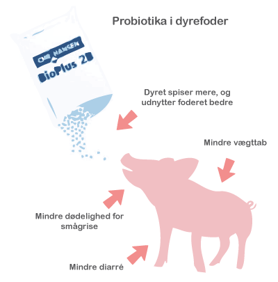 Figur 53. Probiotika til dyr hjælper dyret med at blive sundere. Ved indtag af probiotika spiser dyret mere, de udnytter deres foder bedre, de har mindre vægttab, de får mindre diarré. Smågrise der indtager probiotika har også lavere dødelighed.