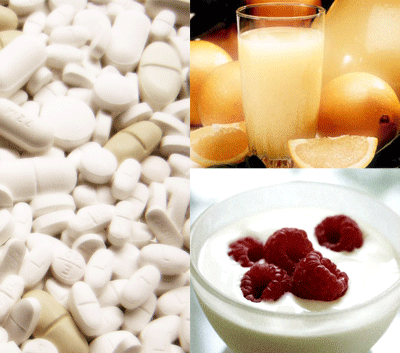 Figur 44. Her ses forskellige produkter, som probotika indgår i – kosttilskudsprodukter øverst og fødevareprodukter nederst (yoghurt, ost og juice).