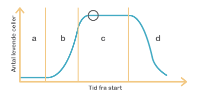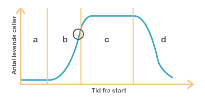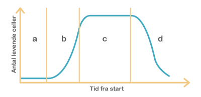 Figur 47. Bakterier vokser i faser. I den første fase (a – latensfasen) tager det tid for bakterierne at komme i gang med at dele sig, og der ses ikke stigning i bakterieantal. I næste fase (b – eksponentiel fase) har bakteriene det godt, og hver bakterie deler sig og bliver til to nye, hvorved bakterieantallet vokser eksponentielt. Herefter (c – stationær fase), når bakterierne er ved at løbe tør for næringsstoffer, og der ophobes affaldsstoffer, er der nogle bakterier, der dør, mens andre stadig deler sig, og bakterieantallet er konstant. Til sidst dør bakterierne (d – dødsfasen).
