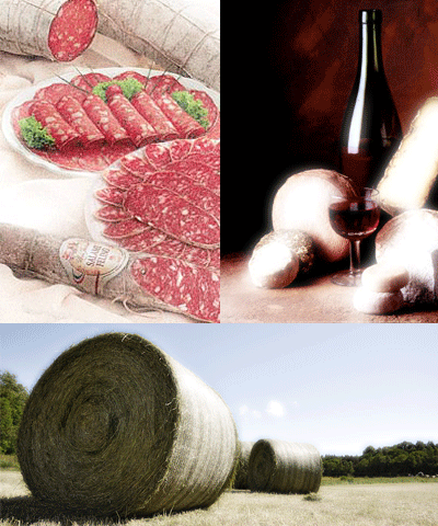 Figur 45. Mælkesyrebakterier anvendes i mange forskellige varer, især for til at øge holdbarheden og fermentere varen. På billederne ses ost, pølser, vin og ensilage.